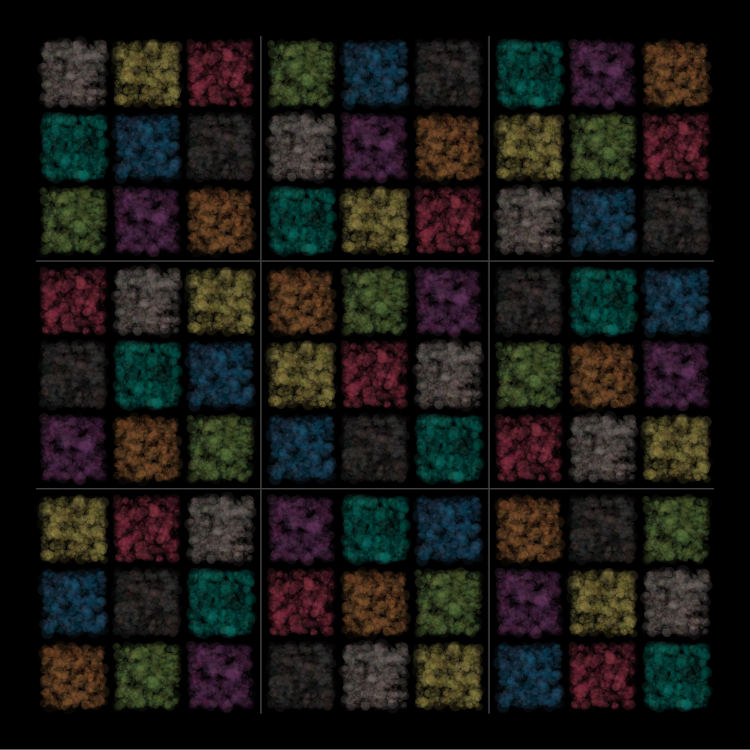 The following piece is cover art designed for Moving Parts LLC's new Sudokinoes puzzles. The color pattern creates a solved Sudoku puzzle.