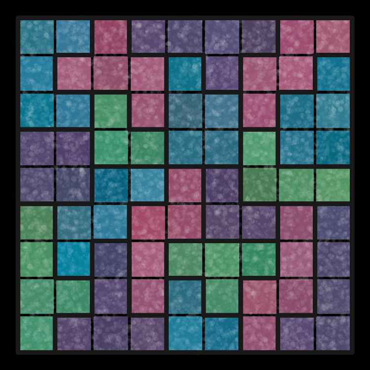 The following piece is cover art designed for Moving Parts LLC's new Sudoku Tangle puzzle. The color pattern reflects the shapes of the actual pieces, although in fact they are stained, wooden pieces.